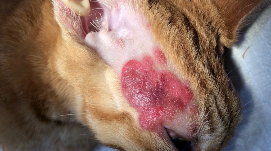 - 貓頻繁的搔癢似皮膚過敏,抓傷臉部與耳朵前緣,也會造成全身紅疹甚至臉腫,甲亢藥物引發的典型皮膚潰爛如上所示,嚴重時得停藥跟使用類固醇治療。