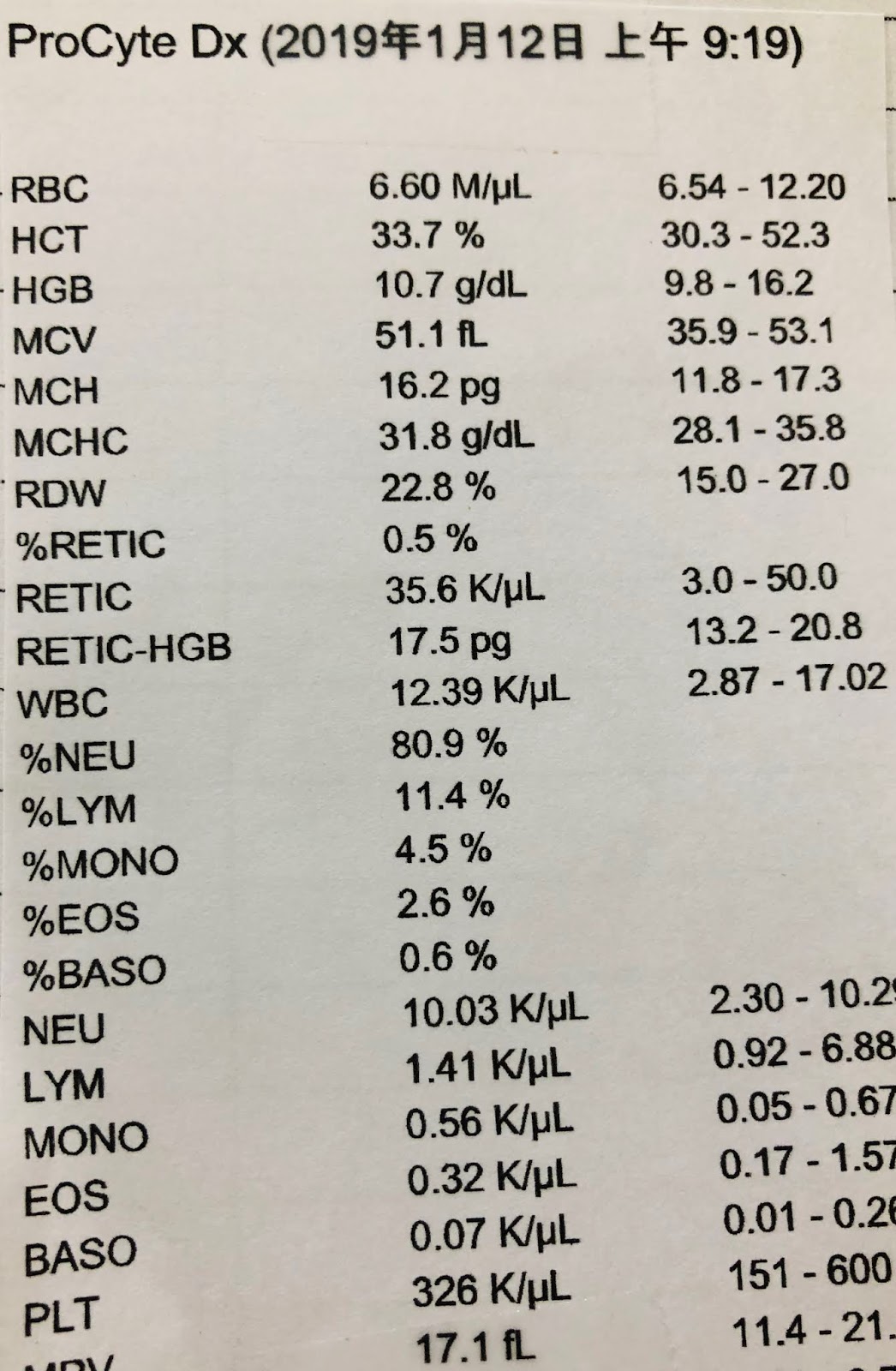 這是一隻因嚴重膽管肝炎而引發貧血的貓,初診時全身黃疸,虛弱無力。血容比(HCT)還不到9%(正常要30%以上,低於15%就達緊急輸血標準)。但注意RETIC高達221.6,告訴我們貓正在造血,但可能生成速度不夠快(因為都沒吃飯),來不及變成正常紅血球,雖然數據看起來很可怕,但理解後就不用擔心,所以我們告知主人可以不輸血。